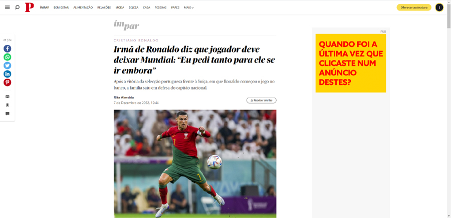Passaram-se meses até chegar a uma conclusão. Engonhei um bocado, tive algumas ideias mas desisti de todas! Até que em Outubro deste ano se fez luz 🙂 Pagar por publicidade é como pagar por um produto: pagar = apoiar! Este era o esclarecimento que faltava! Muito do que a Ghome é assenta neste princípio, e faz sentido que este seja o princípio orientador da publicidade paga da Ghome. Daqui até chegar à conclusão que apoiar o Público faz mais sentido do que apoiar a Meta ou a Google, foi rápido. Eu apoio o Público há alguns anos porque assino o jornal online. Juntar a este apoio um negócio meu que precisa de fazer publicidade, é uma forma de reforçar a confiança no trabalho que eles fazem. Quando contactei o Público falei primeiro com a Erica e depois com a Rita que foram incríveis em guiar-me por todo o processo sempre com conselhos e sugestões impecáveis. No processo descobri que a Rita já morou em Sintra, e que temos amigos em comum! Isto bate qualquer rede social!
